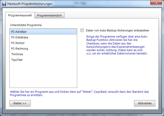 Copy Backup - Hastasoft-Programmsicherung- und Wiederherstellungs- Dialoge |