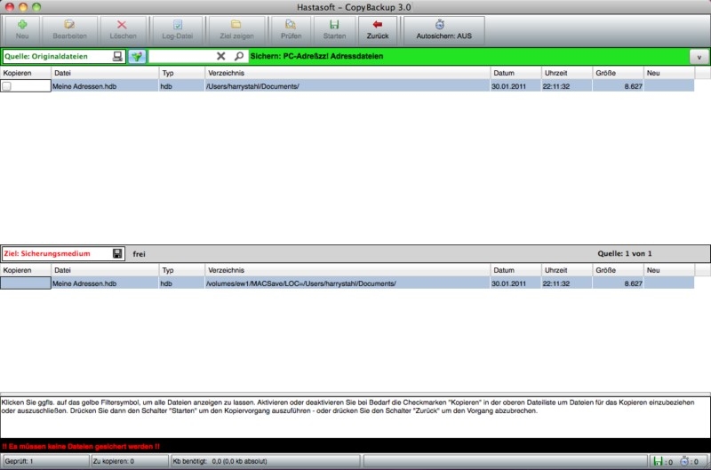 ![]() Hier dargestellt eine Sicherung für PC-Adreßzz! -Adressdateien. Neuere und veränderte Dateien werden automatisch zur Auswahl markiert. Es ist aber manuell möglich, einzelne Dateien abzuwählen oder anzuwählen. In der Editzeile kann eine Dateifilter eingegeben werden. Diese Neuerung ab CopyBackup 3.0 ist eine sehr große Hilfe bei großen Dateibeständen. Hier ist keine Sicherung erforderlich, da die zu sichernde Datei zwischenzeitlich nicht verändert wurde, also mit der bereits vorhandenen Sicherungskopie identisch ist.