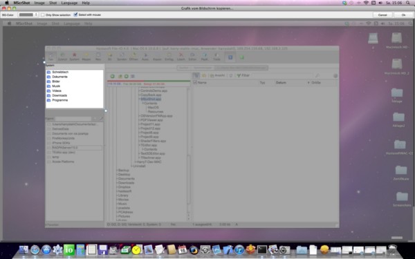 Hier sehen Sie die Liste der von Ihnen erstellten Screenshots. Es stehen verschiedene Kontextbefehle zur Verfügung, womit Sie eine Datei löschen, per e-Mail versenden oder auch in der Größe verändern können (maßstabsgetreu skalieren). Super praktisch ist auch der Umstand, dass Sie ganz schnell zwischen verschiedenen Ablageorten der erstellten Bilder umschalten können. Ich benötige z.B. manchmal die Bilder nur auf einem Windows-Rechner, der mit dem MAC verbunden ist. Dann wähle ich direkt unter "By User" ein Netzwerkverzeichnis aus und muss die Dateien nicht erst umständlich über das Netz kopieren.